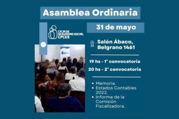 Cabe recordar que, este martes 11 de abril se realizará la tercera reunión informativa para afiliados al Régimen Social. La misma se efectuará en la sede de la Caja a las 19 hs. En tanto, la Asamblea Extraordinaria está convocada para el próximo 18 de abril, en el Salón Ábaco, en Belgrano 1461.