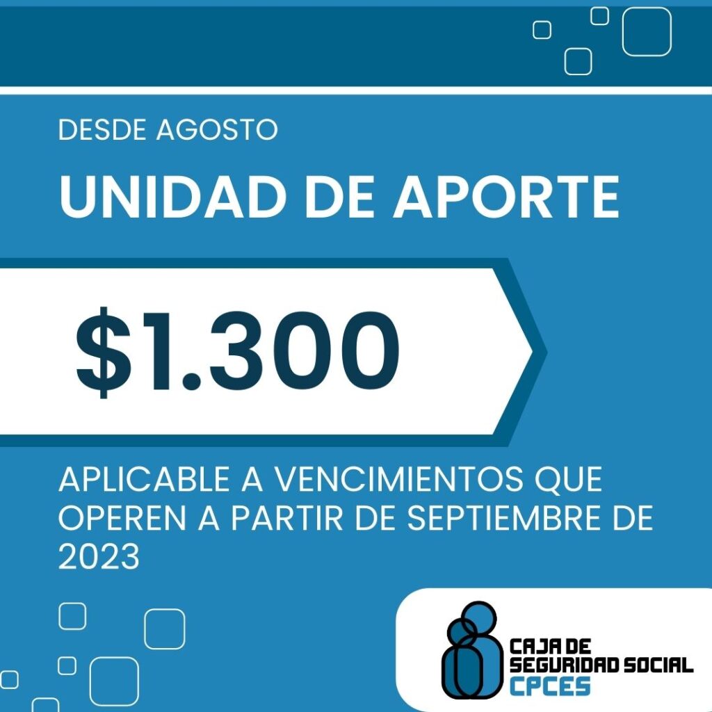 A partir del mes de agosto de 2023, cuyo vencimiento de pago opera en el mes de septiembre, el Valor de la Unidad de Aporte será de $ 1.300 (Pesos mil trescientos).