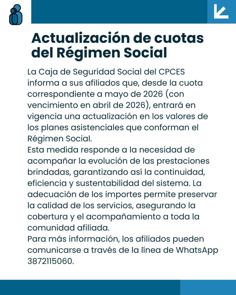 La Caja de Seguridad Social del CPCES informa a sus afiliados que, desde la cuota correspondiente a mayo de 2026 (con vencimiento en abril de 2026), entrará en vigencia una actualización en los valores de los planes asistenciales que conforman el Régimen Social.