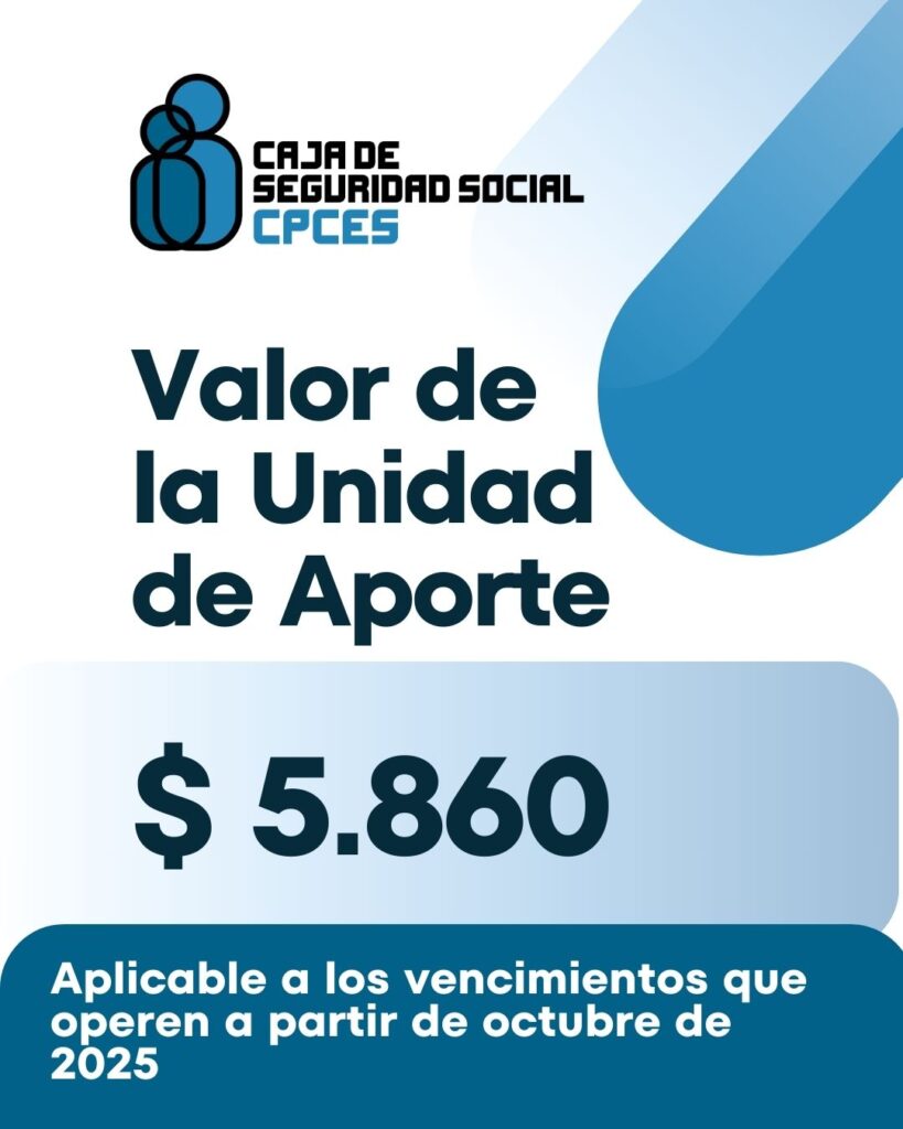 La Caja de Seguridad Social del Consejo Profesional de Ciencias Económicas de Salta informa que, a partir de los vencimientos correspondientes a octubre de 2025, el valor de la Unidad de Aporte se actualizará a $5.860.