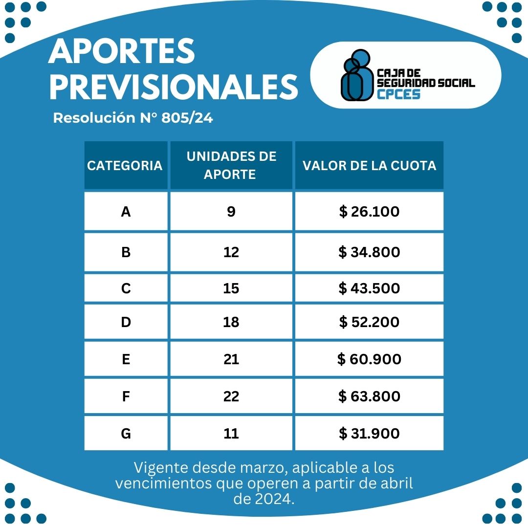 De acuerdo a la Resolución 805 emitida por el Directorio de la Caja de Seguridad Social del CPCES, la escala de valores de los aportes según las distintas categorías será el siguiente: